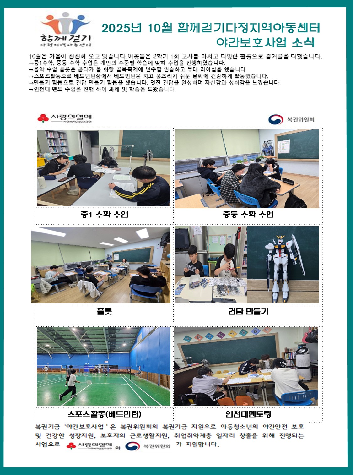 [사랑의 열매 복권기금 야간보호사업] 2025년 10월 수업 및 활동사진