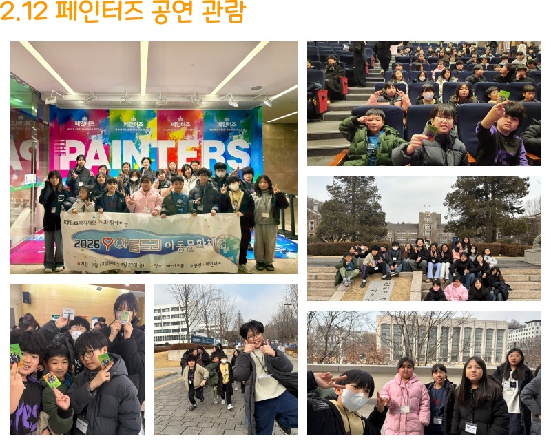 2월 12일 KT&G 복지재단과 함께하는 아동문화체험이 진행되었습니다. 우리 아이들이 미래에 갈 연세대학교에서 점심 식사를 했고, 서울 서대문에 있는 NH아트홀에서 페인터즈 공연을 관람했는데, 눈앞에서 펼쳐지는 마법 같은 미술 쇼가 인상적이었습니다.